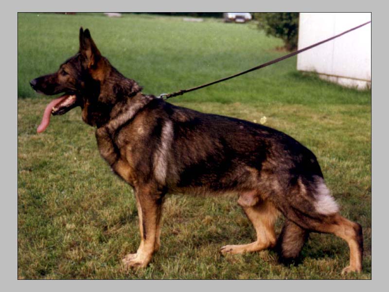 Tall, medium strong, very streched. High Withers, firm back, croup a bit short and sloping. Front not quite straight, angulation still good, Front pasterns should be firmer. Walks straight rear and front, sufficient reach in gaiting. Sound temp., harness, courage and fightdrive pronounced, does out. Resurvey 87: Very good condition, back ligaments have lost firmness.