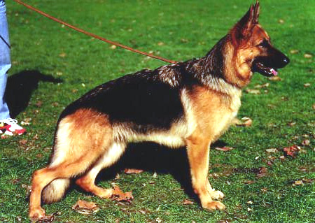 Typey and full of expression, over-medium sized, medium strength and substantial. Very good overall proportions. High withers, good topline. Long and well positioned croup. Very good angulation in front and rear. Good chest proportions. Straight movement. Powerful, outreaching gait with good rear drive and free outreach. Courage pronounced: Does out.