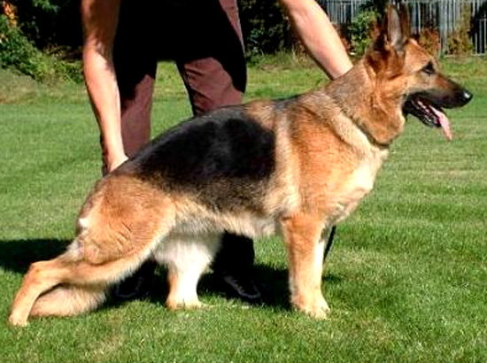Medium tall, medium strong, very typey and expressive, dry and firm. High withers, good backline, very good length and position of the croup. Good angulation of the front and rear, even chest proportions, correct front. Walks narrow in the back, straight in the front, ground covering gaits with effective push and free reach. Sound temperament, hardness, courage and fightdrive pronounced; does not out. RS 93: in accordance with the age the further development has been excellent, is noticed by hi...Medium tall, medium strong, very typey and expressive, dry and firm. High withers, good backline, very good length and position of the croup. Good angulation of the front and rear, even chest proportions, correct front. Walks narrow in the back, straight in the front, ground covering gaits with effective push and free reach. Sound temperament, hardness, courage and fightdrive pronounced; does not out. RS 93: in accordance with the age the further development has been excellent, is noticed by his high degree of temperament.