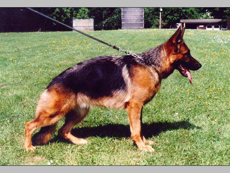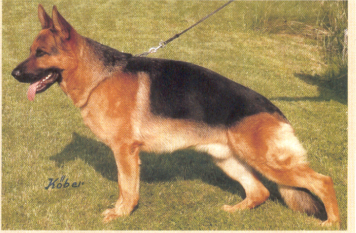 Bigger, Strong, very good proportion, very beautiful type, Strong head, very good angles of the pre and hind angulation. Beautiful upper and Unterlinie, correct front, firm back, clean strong and roomy gait. Safe nature, hardness, courage and combat impulse pronouncedly; discharges.