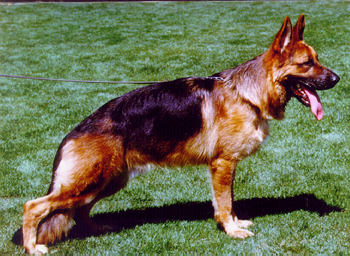 Sehr ausdrucksvoller, großer, kraft- und gehaltvoller Rüde mit hohem Widerrist, geradem Rücken und einer langen, gut gelagerten Kruppe. Gute Winkelungen und Brustverhältnisse, die Front ist korrekt. Geradetretend, weit ausgreifende Gänge mit kraftvollem Nachschub und freiem Vortritt. TSB ausgeprägt; läßt ab.