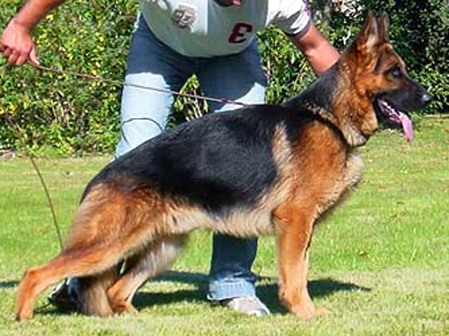 Very well pigmented, over medium size, powerful, substantial, slightly elongated, dry, firm, very good expression. High, long withers, straight, firm back, good length and position of the croup. Very well angulated fore, hindquarters, balanced chest ratios, straight front, straight stride, fluid gait with powerful follow-through and free stride. Secure nature, TSB pronounced; does not let off.