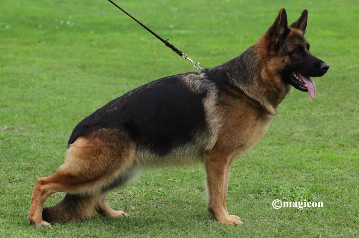 Large, strong, very expressive, dry and firm male with correct building conditions, very strong head with dark mask, high withers, straight back, very good length and position of the croup, balanced chest ratios, correct front, back and front straight kicking, wide-ranging, powerful corridors with free protruding and very effective replenishment with very good sublimeness. Beings safe, TSB pronounced.Großer, kräftiger, sehr ausdrucksvoller, trockener und fester Rüde mit korrekten GebÃ...Read more