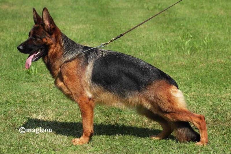 Large, strong, rich, very good building conditions, very well shaped, expressive head with dark mask and dark eye. Very good upper line course with very well formed withers. Good croup position, of sufficient length. Very good angles, balanced chest ratios, straight front. Correct step and step sequence, very productive increment with effective replenishment and free advance. TSB.Special Qualites: Anatomically very correct and very expressive male.Groß, kräftig, gehaltvoll, sehr gute ...Read more