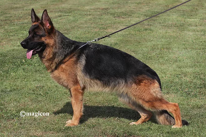 Over-medium size, medium strong, solid, masculine general appearance, much charisma, deep black color over the back, very good building conditions, prominent head (stud like), high withers in the stand and the movement, straight, firm back, good length and position of the croup, very good forehand structure, very well angulated hindquarters, straight front lines, balanced chest conditions, far-reaching, clear gait from firm back. Secure nature, TSB pronounced.
