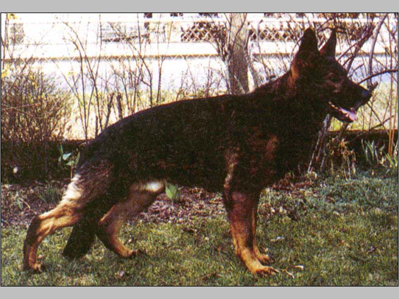 Tall, strong, slightly sloping croup, very good angulation of front and rear, dry and firm. Straight front, straight gaiting. Fluid, far reaching gaits. Very good temperament, hardness, courage and fighting instinct pronounced. Resurvey 82: Very good condition.