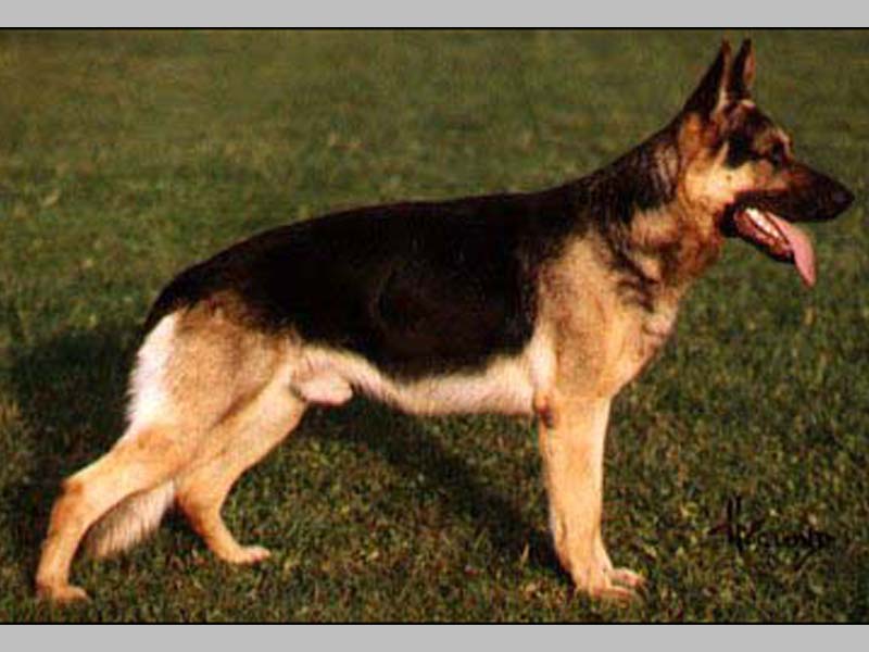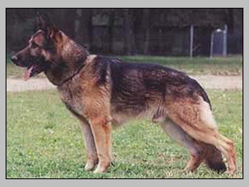 Tall, strong boned, expressive, stretched male. High withers, firm back, slope croup is pronounced. Very good chest proportions, upper arm is straight, elbows are more firm, powerful rear quarters, straight front. Walks straight front and back, push from the rear is powerful, front reach should be more free. Sound carefree temperament, hardness courage and fightdrive pronounced; does out.