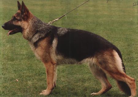 Große, mittelkräftige, trockene und feste Hündin mit hohem Widerrist, schöner Rückenlinie und langer, gut gelagerter Kruppe. Gute Winkelungen und Brustverhältnisse, korrekte Front. Geradetretend zeigt sie weit ausgreifende Gänge mit kraftvollem Nachschub und freiem Vortritt. Sicheres Wesen, Härte, Mut und Kampftrieb ausgeprägt; läßt ab. Bigger, medium strong, dry and firm bitch with high Withers, beautiful back line and long, well angled croup. Good angulations ...Read more