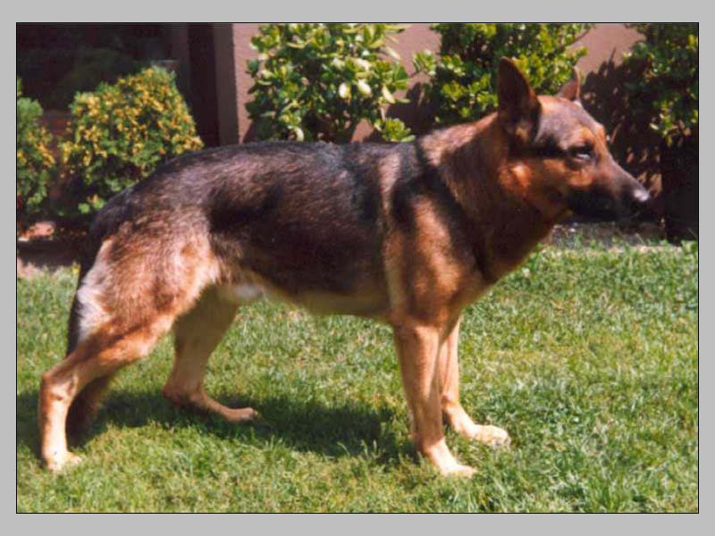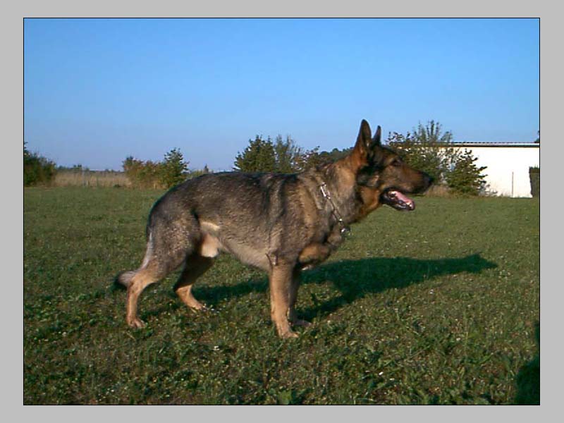 Tall, well pigmented, expressive, strong head, high withers, while well positioned the croup could be longer. The upper arm should be positioned a bit more steeply, very good angulation of the rear, good gaits. Sound temperament, hardness, courage and fightdrive pronounced, does out.