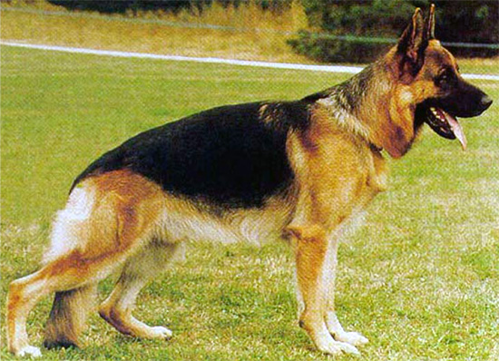 Tall, strong, typey and expressive. Very good head, straight front, high withers, very good top and lower line. Very good front and rear quarters. Walks straight front and rear, very powerful gaiting from a firm back. Sound temperament, hardness, courage and fighting instinct pronounced; does out. RS 93: Very good further development appropriate for his age; does out.