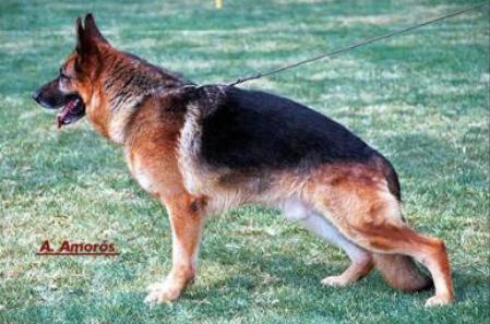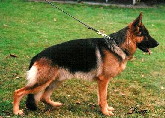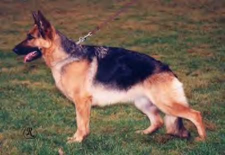 sehr gute Winkel der Hinterhand, gerade Front, ausgeglichene Brustverhältnisse.