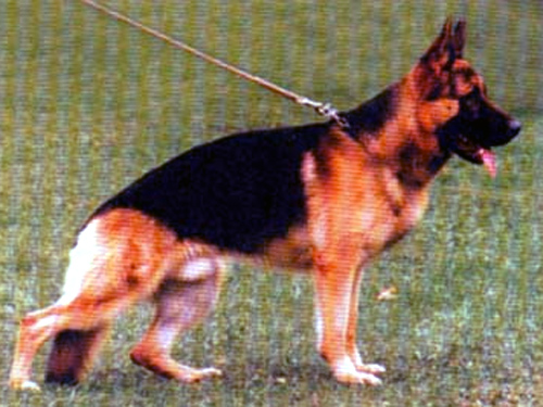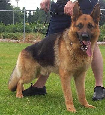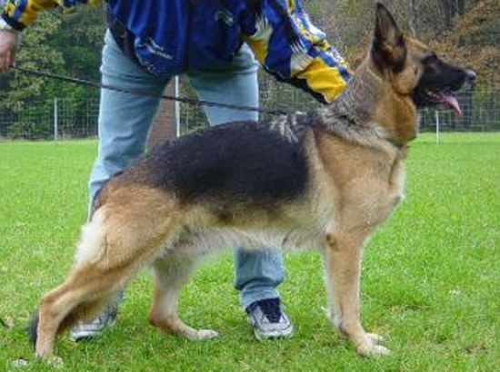 In sehr gutem Rahmen stehend, kräftig gehaltvoll. Straffe Muskulatur, trocken und gefügefest, guter Kopf und Ausdruck, ausgeprägter Widerrist, normale Kruppenlage und -länge. Korrekt gewinkelt, ausgeprägte Vorbrust, gute Unterbrust, kraftvoller Bewegungsblauf. Sicheres Wesen, TSB ausgeprägt; läßt night ab.