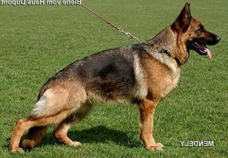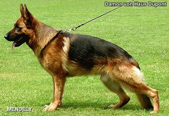 Large, strong, type and expressive, strong head, high withers, firm back, very good length and position of the croup, very good fore and hind angulation, balanced chest ratios, straight front. Straight stride, very good foreleg and powerful follow through. Secure nature, TSB pronounced; lets off.