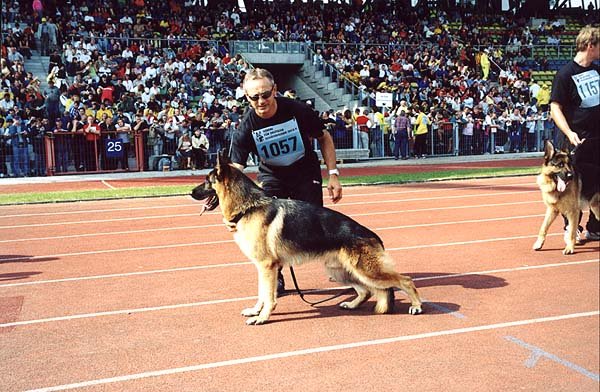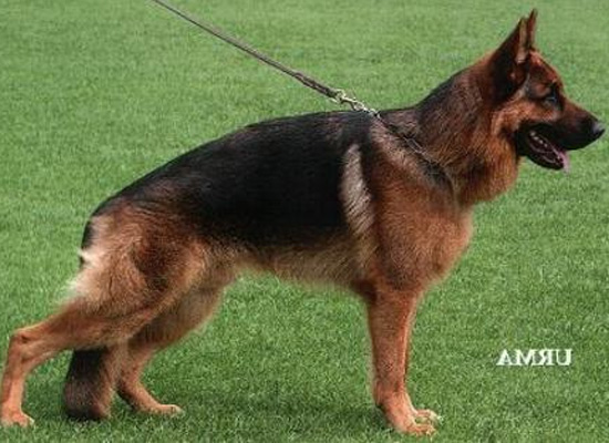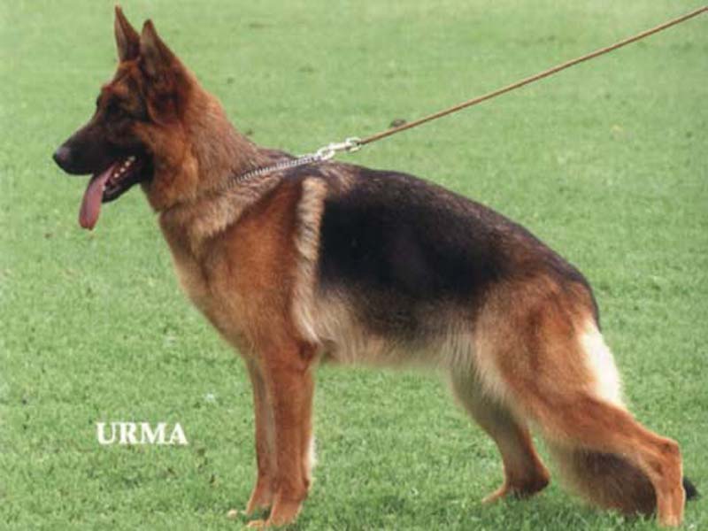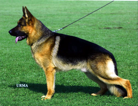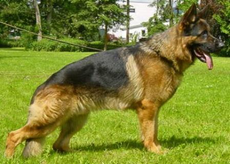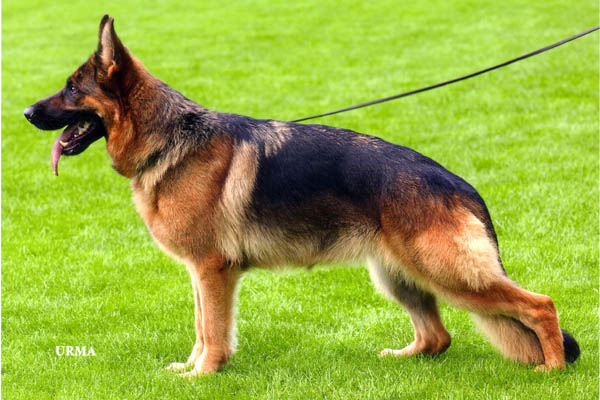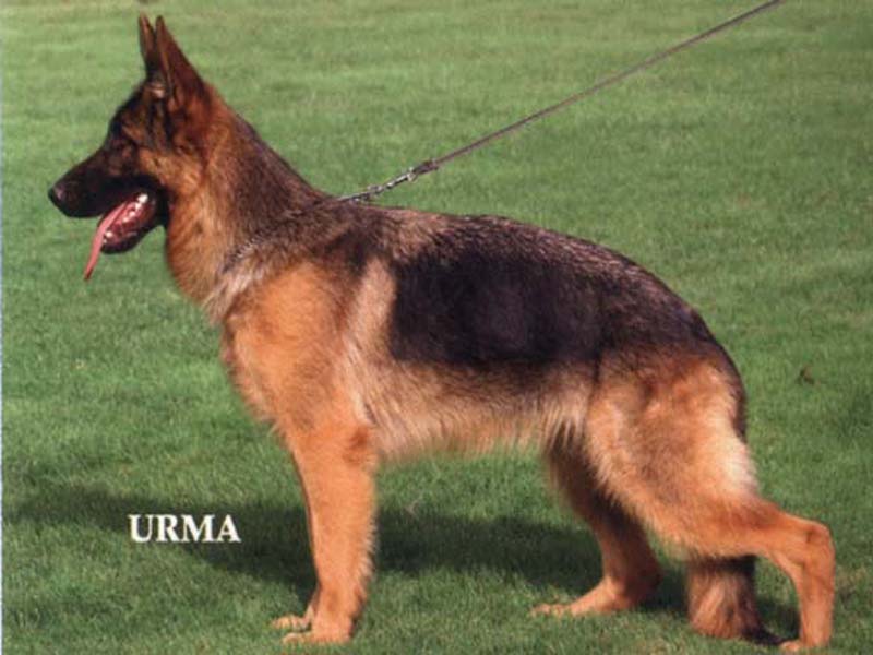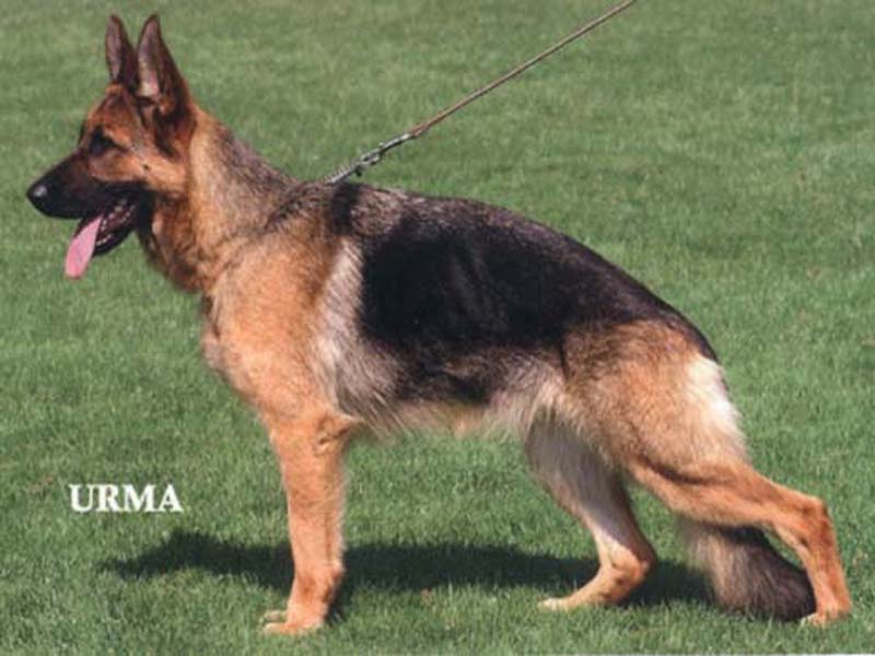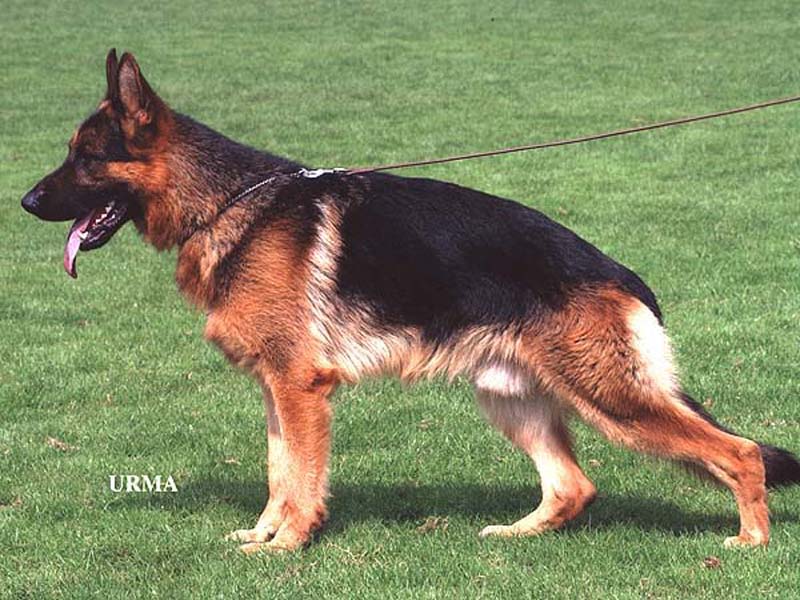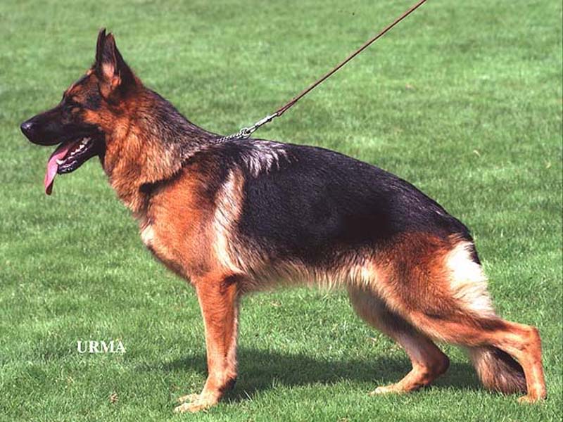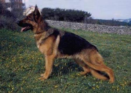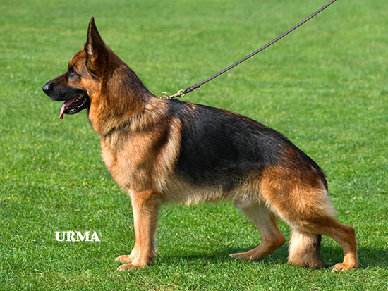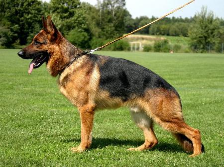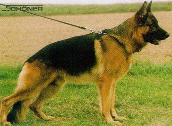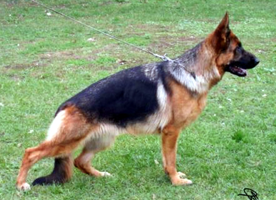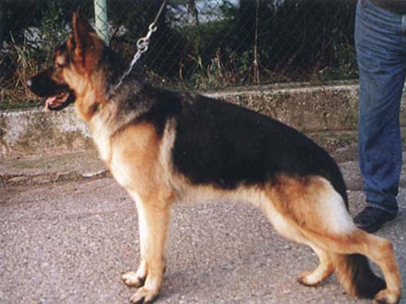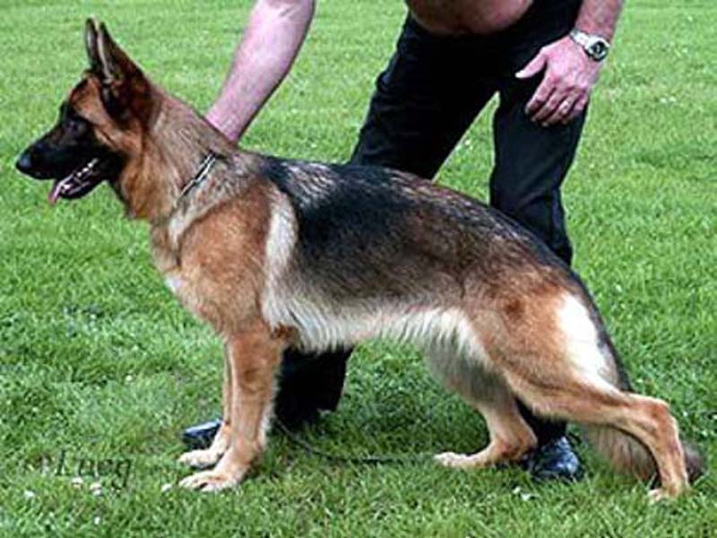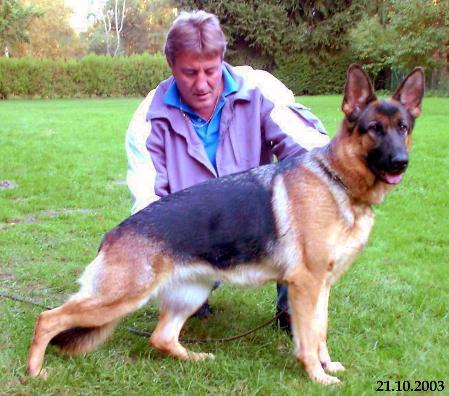 An der oberen Größengrenze stehend,knochenkräftig,gehaltvoll. Kräftiger Kopf,hoher Widerrist,fester Rücken,gute Lage und Länge der Kruppe,normale Front.Gut gewinkelte Vor-, sehr gut gewinkelte Hinterhand,hinten gerade,vorne leicht zehenengtretend, bei kraftvollem Schub der Hinterhand sollte der Vortritt freier sein.TSB ausgeprägt,läßt ab.