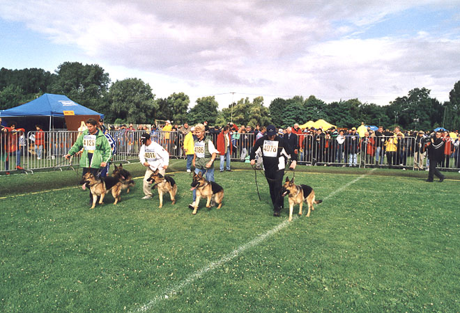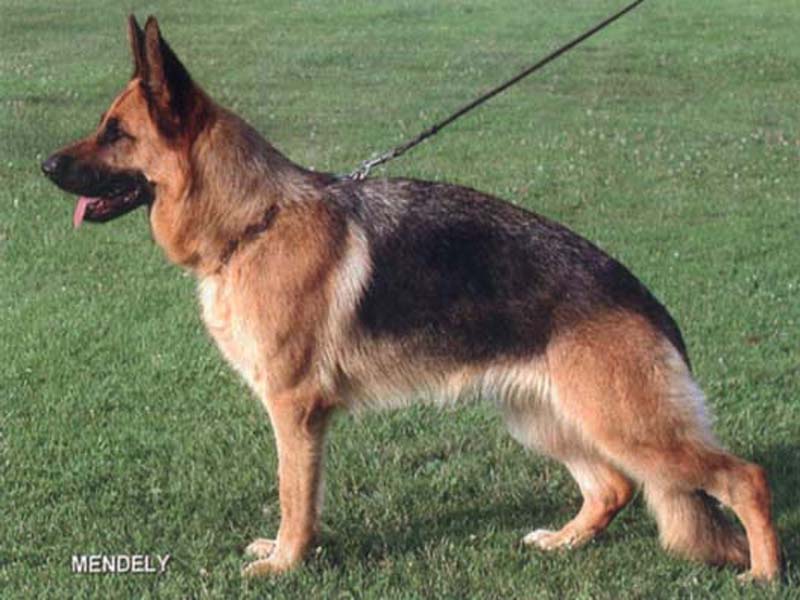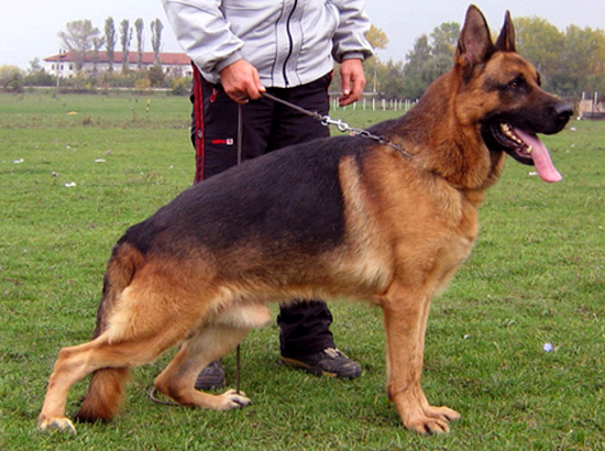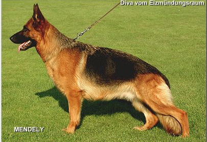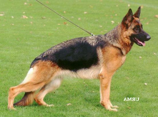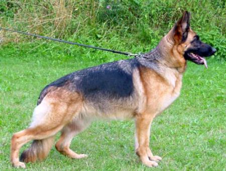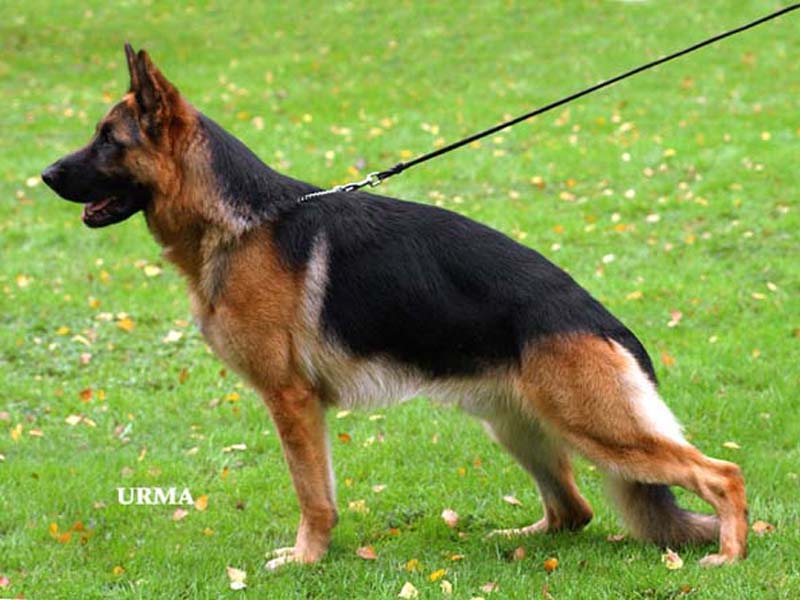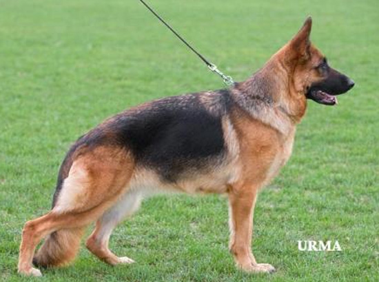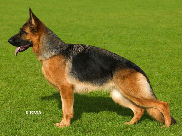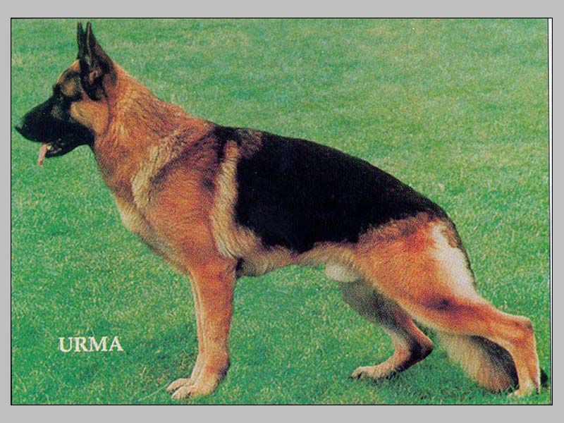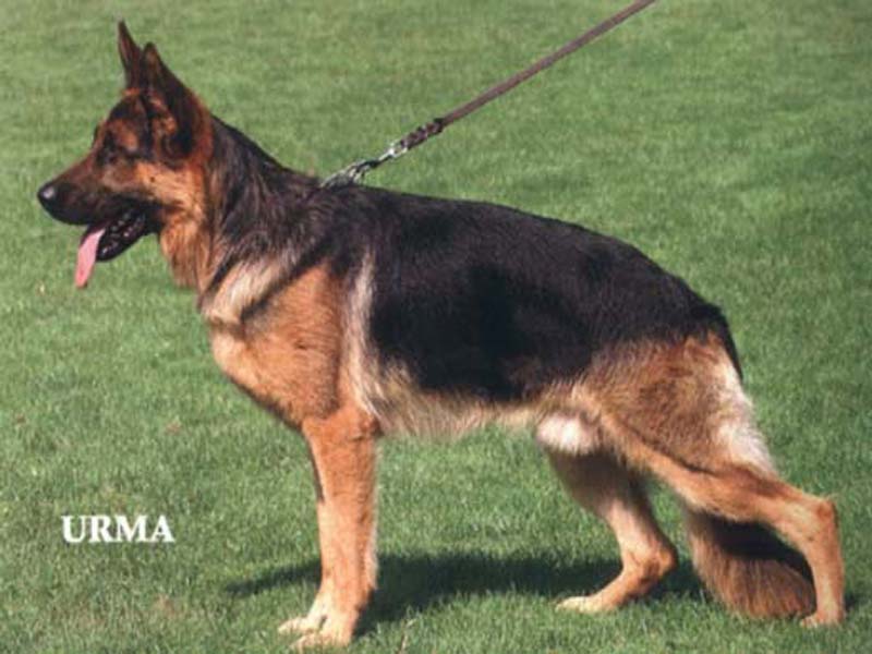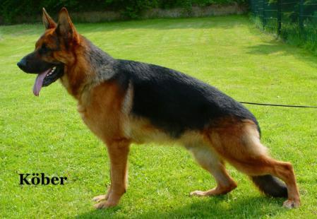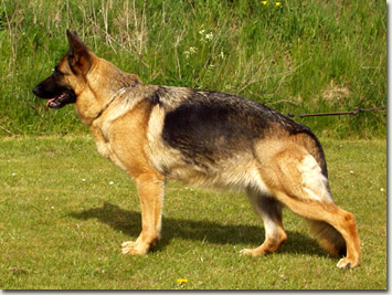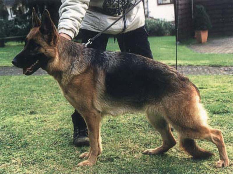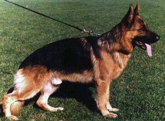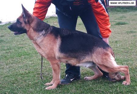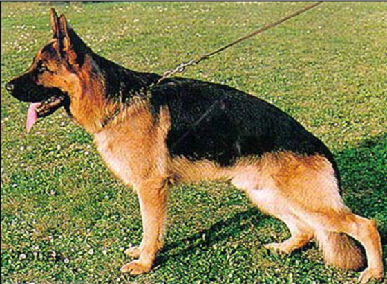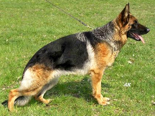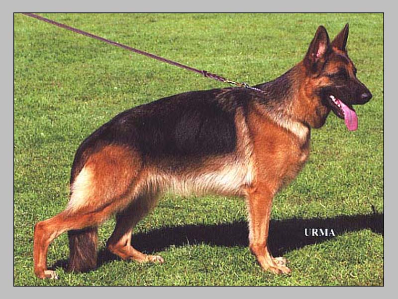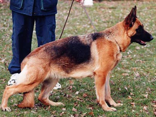 Over medium size, medium strong, drying and firmly, very good expression. High Withers, firm back, good croup, in front well, in the back very well hind, clean front. Balanced Brisket in proportion, clean step-series, strong, roomy gait. Safe nature, UCB pronouncedly; discharges. Hp normally. b) black, brown badges