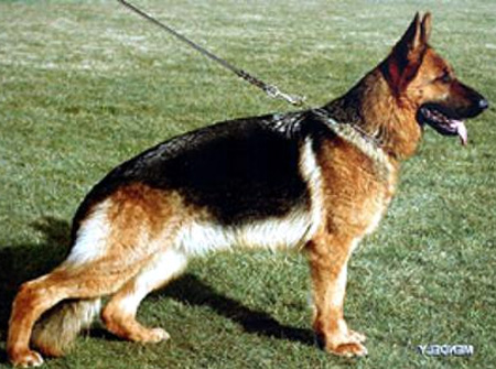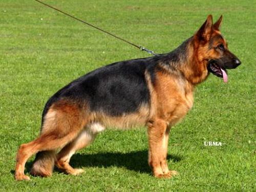 Groß, kräftig, sehr typvoll, hoher Widerrist, harmonische Oberlinie, sehr gute Kruppe in Länge und Lage, sehr gute Winkelungen der Vor- u. Hinterhand, ausgeglichene Brustverhältnisse, korrekte Front. Geradetretend zeigt er kraftvolle Gänge mit viel Raumgewinn. Sicheres Wesen, TSB ausgeprägt; läßt ab.