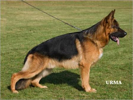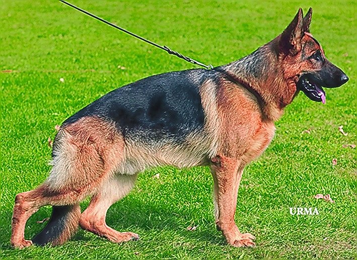 Large, strong, very typey, high withers, harmonious topline, very good croup in length and position, very good angulation of forequarters and hindquarters, balanced chest, correct front. Straight stepping he shows powerful gait with a lot of scope. Confident character, TSB pronounced; lets off.
