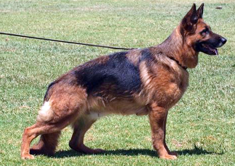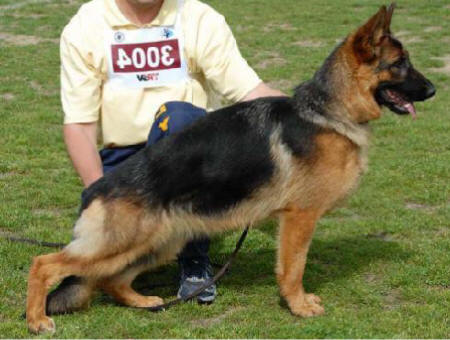 Übermittelgroß, mittelkräftig, gehaltvoll, kräftiger Kopf, sehr schöner Ausdruck, sehr gute Gebäudeharmonie, sehr schöner Linienfluß, betonte Gefügefestigkeit, korrekte Front, ausgeprägter Widerrist, richtig gelagerte Kruppe, sehr gut gewinkelt in der Vor- und Hinterhand, freies, förderndes Gangwerk mit kraftvollem Nachschub. TSB ausgeprägt; läßt ab.