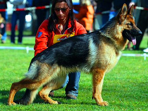 2005 Sieger Show Report:One strong feature is expressed this large substanceful Male. Very pigment-strongly also deeply black color portions, high Withers, straight back and a long well stored croup. Very well bent rear spar and with strong broad clubs. Perfect first option bending with pronounced chest formation and straight front lines. With straight lines step-series it shows very liquid courses of motion with strong supply and productive precedence. This Male enthusiastically among other thi...Read more