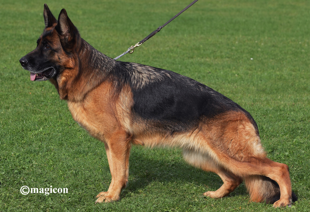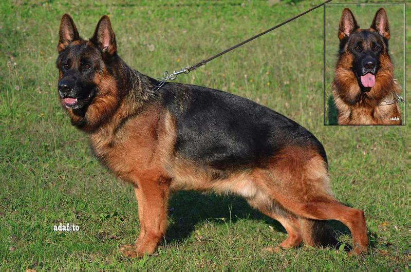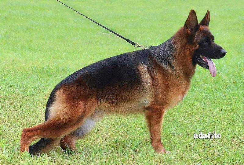 Big, powerful and full-bodied, very expressive, very well pigmented, dry and solid, elongated dog. Strong head with very nice mask, high withers, firm straight back, correct length and position of croup. Very good angulations, balanced chest proportions, straight front. Front and rear stepping, powerful, ground covering gait with free precedence and effective replenishment. Nature surely, UCB pronouncedly;. V. Very strong male character with very good p...Read more