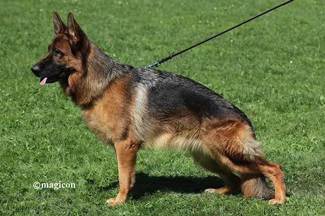 Mittelgroß, mittelkräftig, gehaltvoll, sehr gute Gebäudeverhältnisse, sehr typ- und ausdrucksvoll. Hoher Widerrist, sehr gute Rückenlinie, gute Länge und Lage der Kruppe. Sehr gute Länge und Lage des Oberarms und des Schulterblattes, sehr gute Hinterhandwinkelung. Gerade Front, korrekte Unterlinie, gerade Trittfolge, zeigt sehr kraftvolle, weit ausgreifende Gänge bei sehr guter Erhabenheit. Sicheres Wesen, TSB ausgeprägt.