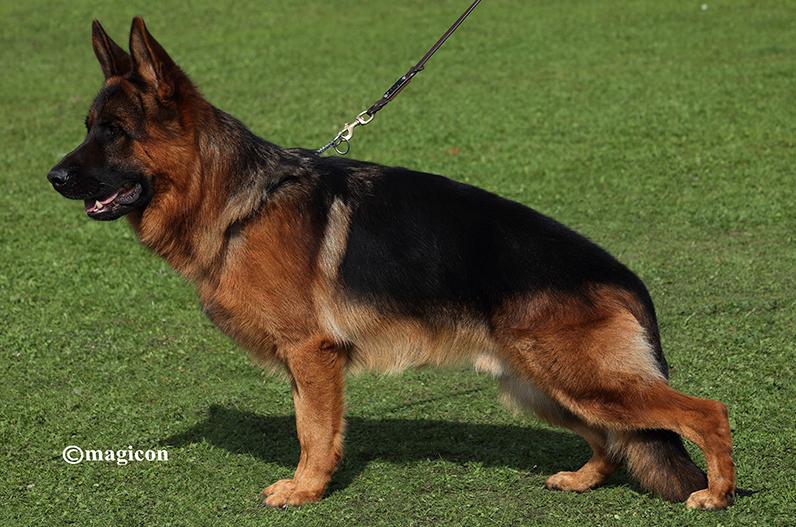 Large, medium strong, very typey and expressive, excellent pigmentation, very good conformation. Very nice, feminine head with very good mask, nice topline and underline, good forequarters, very good hindquarters angulation, correct front and stride, very good, space-creating movement with powerful follow-through and free front stride. TSB pronounced.