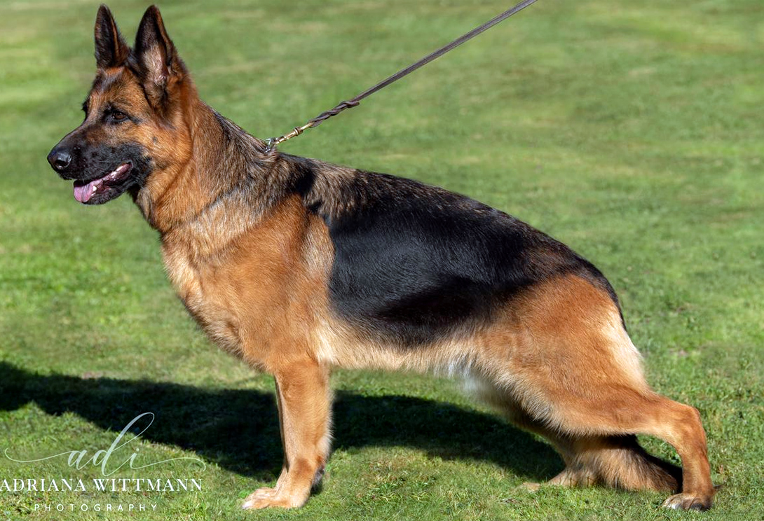 Mittelgroß, mittelkräftig. Guter Kopf, normaler Widerrist, guter Rücken, gute Kruppe, sehr gute Hinter- und gute Vorhandwinkelung, normale Brustverhältnisse, korrekte Front. Geht vorne gerade, die Sprunggelenke sollten fester sein, sehr guter Bewegungsablauf mit wirksamem Nachschub. Sicheres Wesen, TSB ausgeprägt.