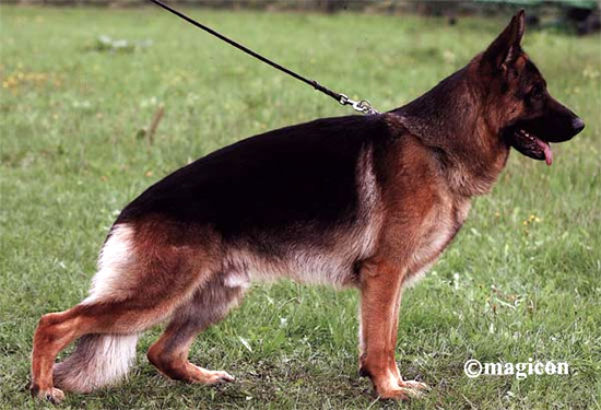 Large, full-bodied, strong, dry and firm, very good body proportions, very good expression, very good pigmentation, good character. High, long withers, straight, firm back, good length and situation of the croup. Front well, the back very well bent, balanced chest proportions, straight front. Just stepping, very powerful, very expansive courses, pronounced in very good Erhabenheit.Sicheres beings TSB.