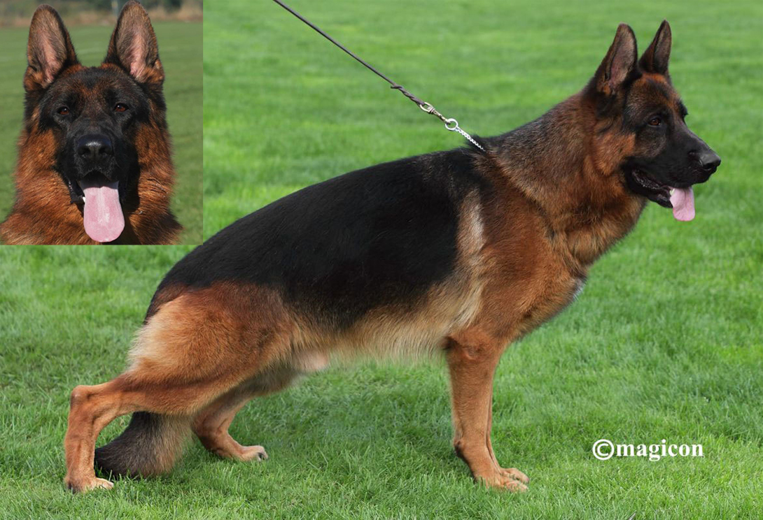 Large, strong, substantial, very well pigmented, very good height and length ratio, strong, very expressive head with correctly carried, firm ears, high, long withers, straight back, very good length and position of the croup, very well angled, strong muscled hindquarters, very well angled forehand with a desirable position of the shoulder blade and upper arm, very good fore-chest, very good, long underbust, straight front, kicking a bit tight at the back with not very firm hocks, kicking straight in front, wide, powerful, flat over the Floor-going corridors with a markedly effective replenishment and very free passage with excellent balance and presentation. Safe being, TSB pronounced.