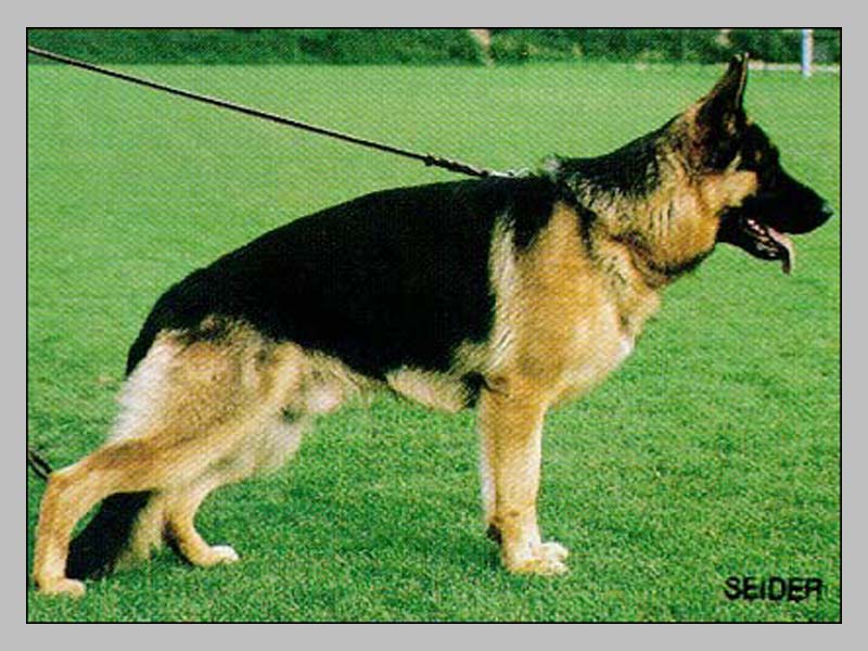 Steht an oberster Größengrenze, kraft-,gehalt-, typ-, ausdrucksvoll, trocken, fest, Widerrist hoch Rückenlinie sehr gut, Kruppenlänge gut, leicht abschüssig.Vor-,Hinterhandwinkel sehr gut, betonte Brustverhältnisse, gerade Front. Geradetretend, Gänge flüssig, raumschaffend, kraftvoll. Nachschub wirksam, Vortritt frei. Wesen sicher, Härte, Mut und Kampftrieb ausgeprägt; läßt nicht ab. Surely Dry, withers highly back line very well, croup length well, easily slo...